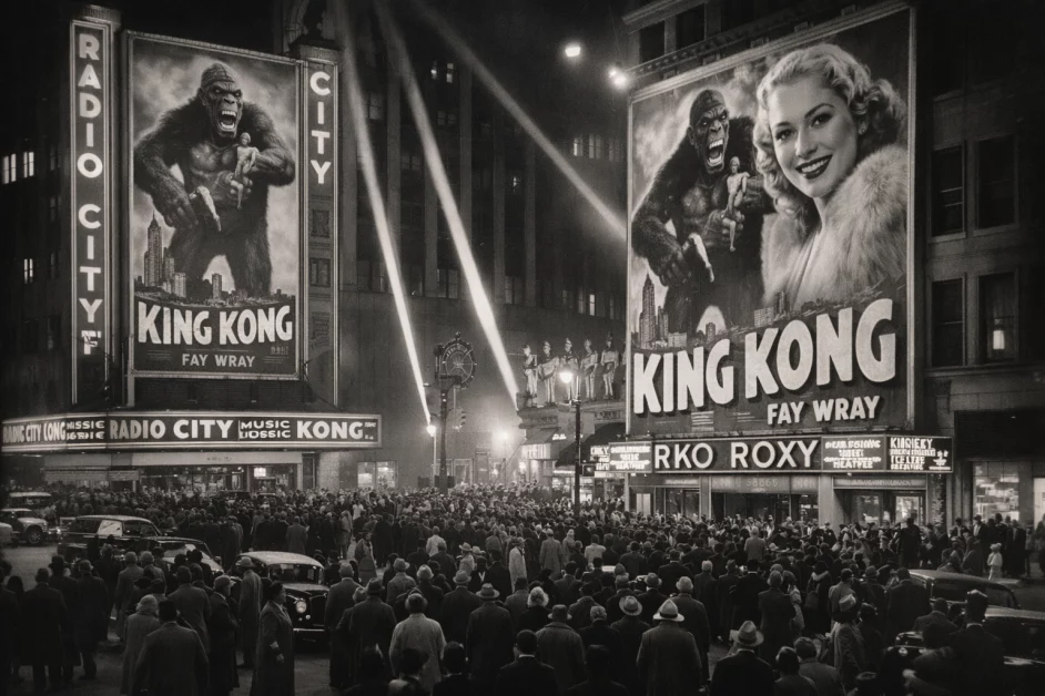 Nel 1933 il leggendario film “King Kong” , diretto da Merian C. Cooper e Ernest B. Schoedsack, con protagonista Fay Wray, debutta al Radio City Music Hall e al RKO Roxy di New York., segnando un momento storico per il cinema fantastico.