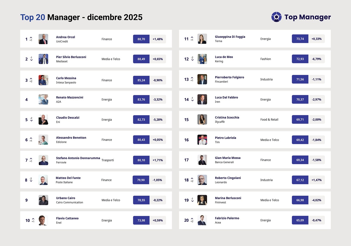 A fine 2025 Andrea Orcel riconquista la prima posizione nella classifica Top Manager Reputation, curata dall’Osservatorio permanente di Reputation Manager SPA SB, ottenendo un punteggio di 88.70. Il Ceo di Unicredit riceve importanti riconoscimenti, tra cui quello di banca dell’anno in Italia e in altri cinque Paesi da The Banker a Londra. Inoltre, Orcel è al 25° posto nella graduatoria delle persone più influenti in Europa secondo Politico, che lo definisce “il Napoleone del sistema bancario”. Sul podio segue Pier Silvio Berlusconi, con un punteggio di 88.49, che ha recentemente presentato i risultati di fine anno di Mediaset, evidenziando l’espansione di MFE in Portogallo con l’ingresso nel capitale di Impresa.