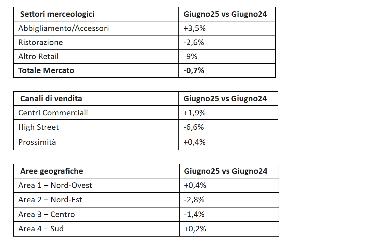 Nel mese di giugno, sorprendentemente, l’abbigliamento e accessori registra un incremento del 3,5%, accompagnato da una buona partenza dei saldi a +2,7%, stimolati dall’afflusso di turisti. Al contrario, la ristorazione mostra una flessione del 2,6%, e il comparto “altro retail” evidenzia una caduta del 9%. I settori legati ai beni durevoli e all’intrattenimento vivono un periodo complicato, mentre quelli dedicati alla cura della persona sembrano tenere meglio.