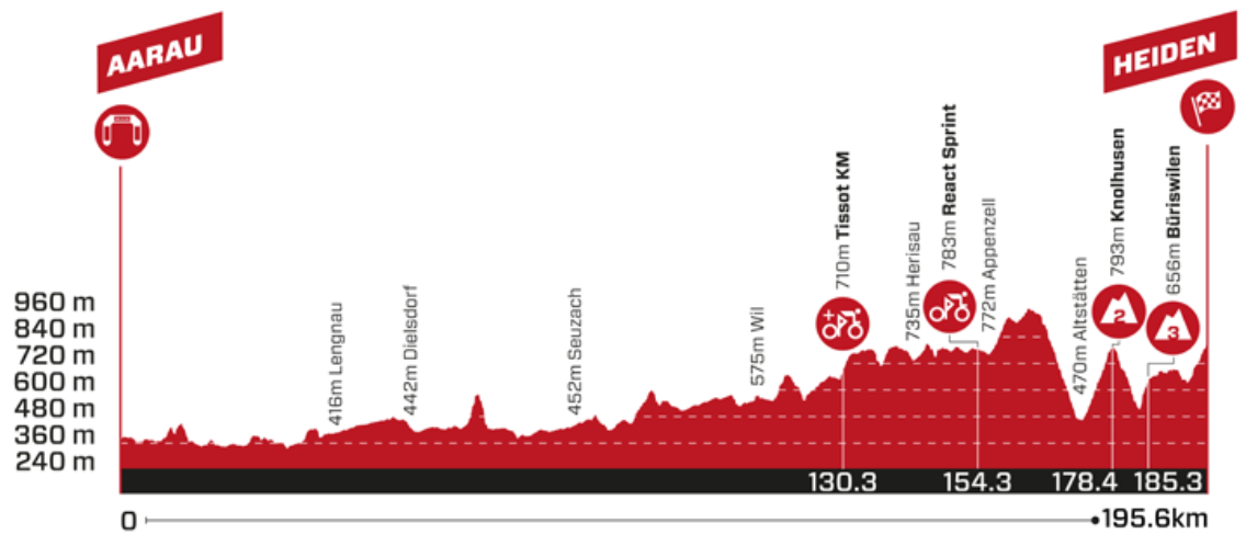 La tappa di oggi presenta un tracciato ondulato, con strappi iniziali che potrebbero favorire attacchi strategici. I ciclisti affronteranno la salita di Knolhusen, categorizzata di seconda, con una lunghezza di 5,1 km e una pendenza media del 6,4%. La successiva discesa condurrà verso Buriswilen, una salita di terza categoria di 2,1 km al 7,4%. Solo alla fine, i corridori affronteranno il segmento conclusivo, una salita di circa 3,5 km al 5,2% che culmina nel traguardo di Heiden.