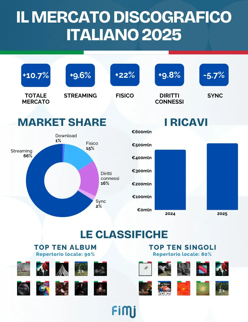 Parallelamente al digitale, il mercato dei supporti fisici continua a consolidare la sua presenza con una crescita significativa del 21,9%, toccando valori di 74,7 milioni di euro e rappresentando il 15% dell’intero settore. Il vinile si conferma il formato preferito dai collezionisti e superfan, con un incremento del 24,2%, mentre anche i CD evidenziano una ripresa sostenuta, con un +15,1%. Complessivamente, sono stati venduti 4,6 milioni di prodotti fisici nel 2025, suddivisi quasi equamente tra CD (51%) e vinili (47%). Quest’evoluzione testimonia l’importanza della dimensione esperienziale e collezionistica nel consumo musicale contemporaneo.