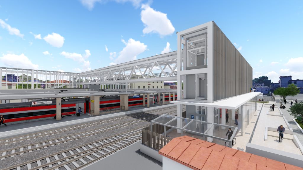 Il piano terra ospiterà una struttura in acciaio e vetro, garantendo luminosità e una maggiore integrazione con l’esterno. Le facciate delle aree laterali alla stazione saranno riqualificate per ospitare locali tecnici e di servizio. Per potenziare la connessione tra le due parti della città, divise attualmente dal fascio binari, sarà realizzato un sovrappasso pedonale costituito da una struttura reticolare di circa 57 metri coperta da pannelli fotovoltaici.